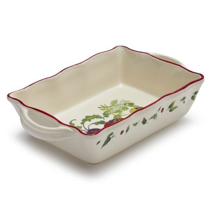 - Bon appétit!Our durable white earthenware baker with curvy red edges features a selection of colorful produce from Jacques Pépin's vegetable paintings